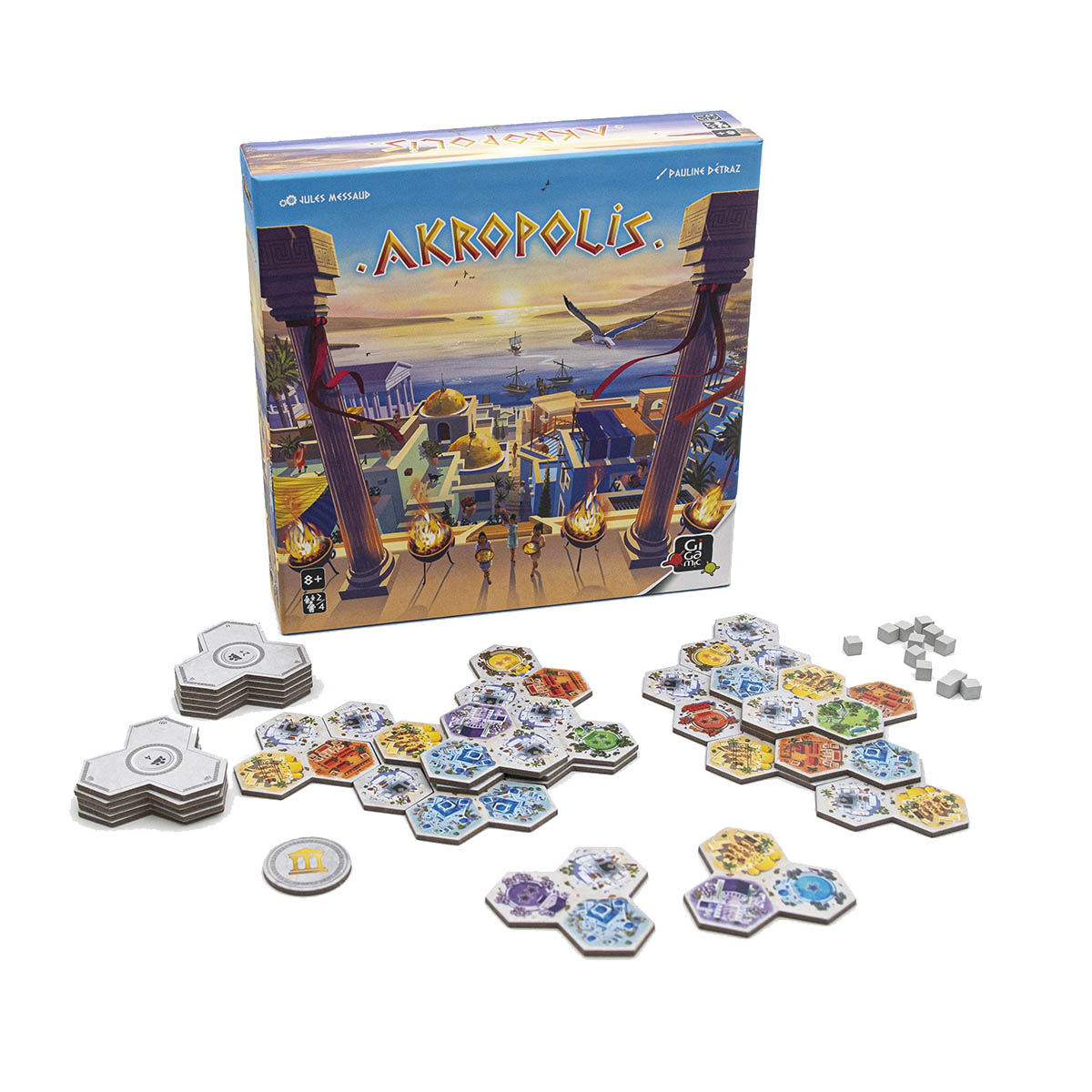 En Akropolis, los jugadores construyen una ciudad griega optimizando la colocación de distritos y alturas para maximizar puntos. Cada decisión influye en el desarrollo urbano.